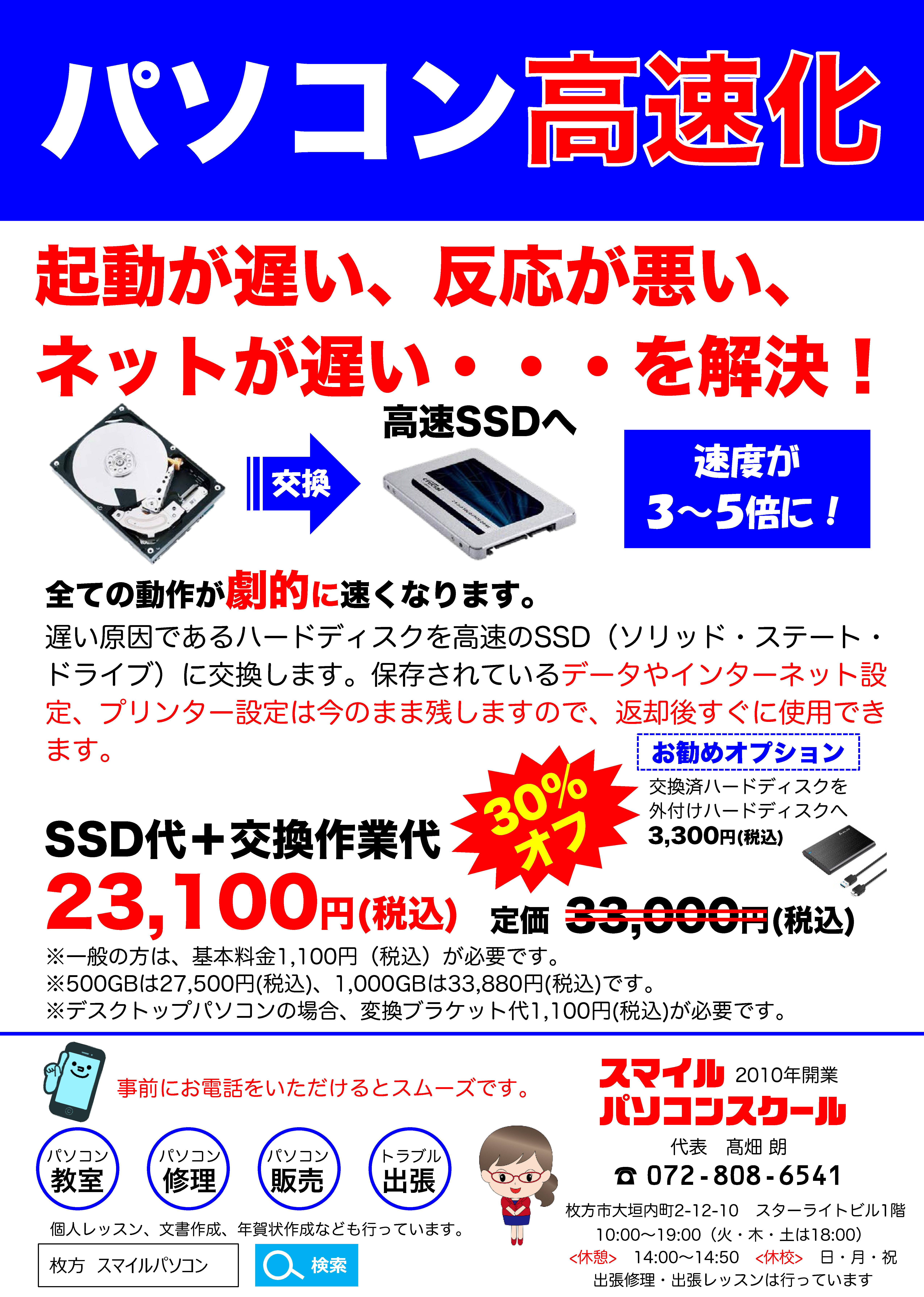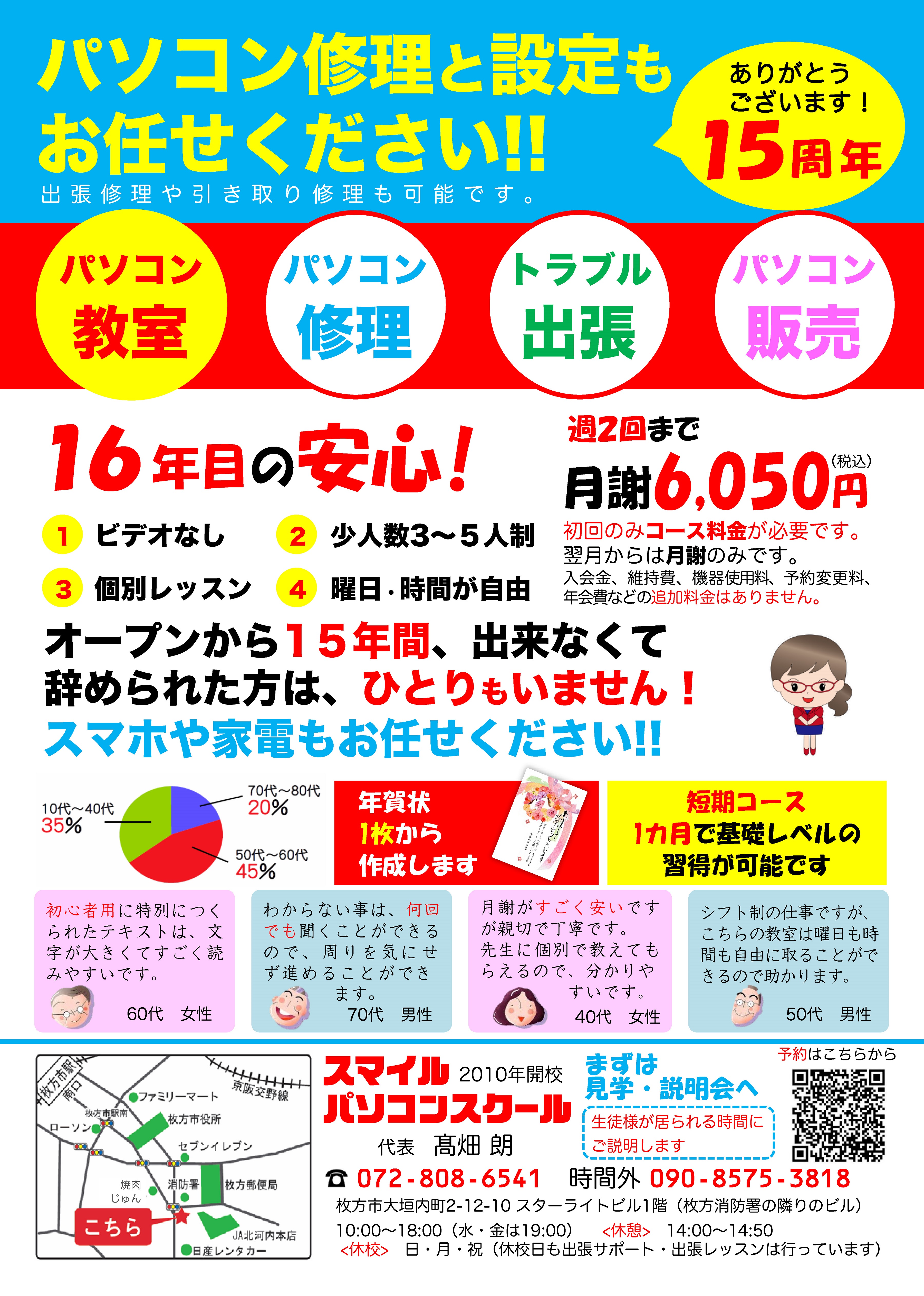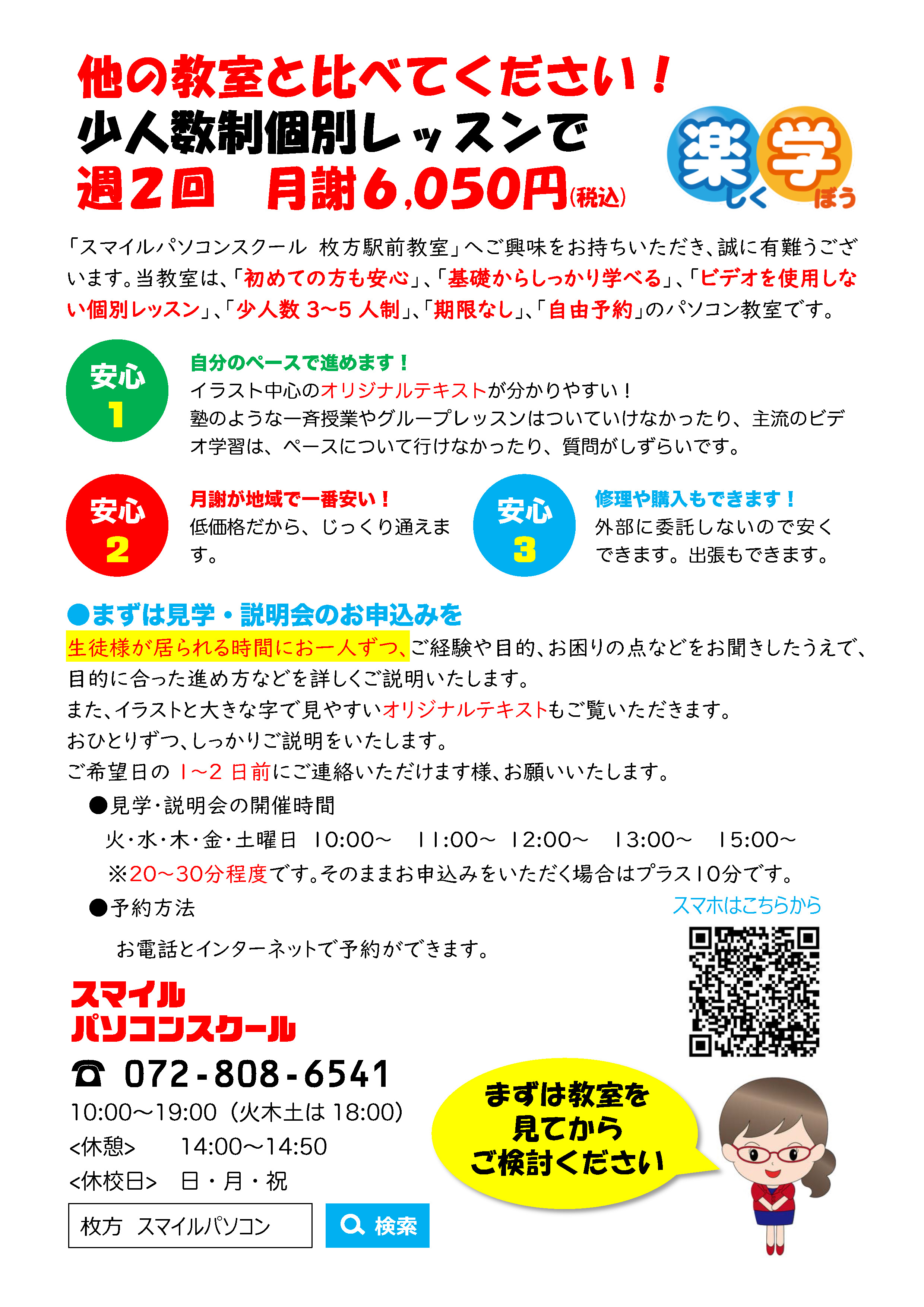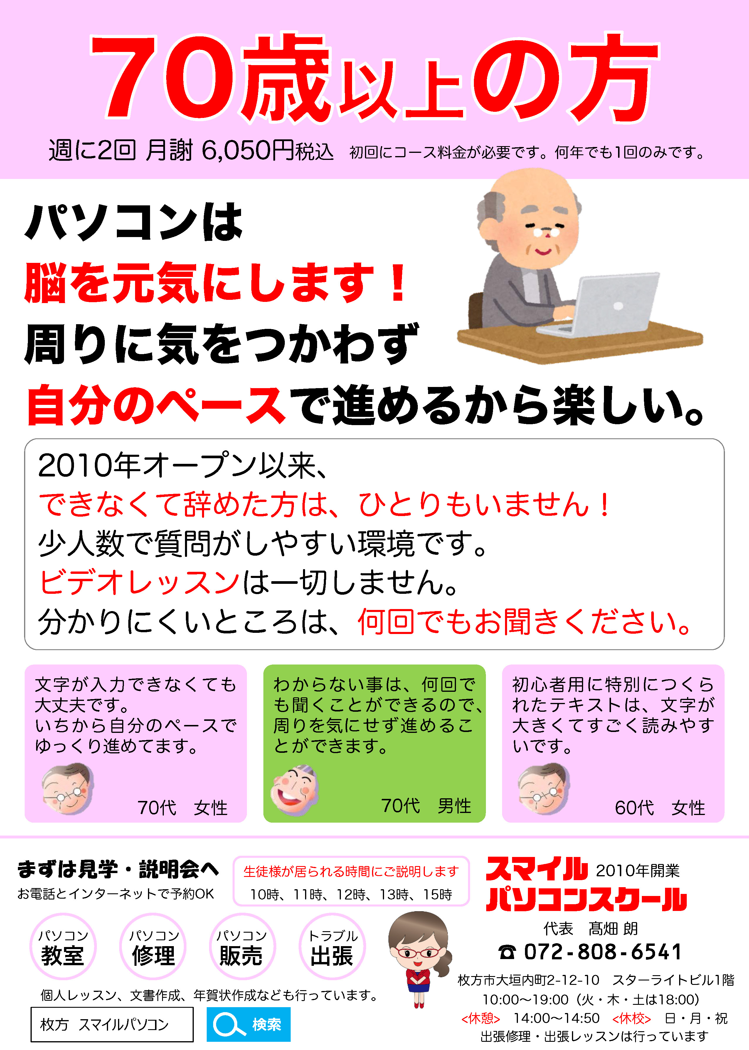 月謝が安い! 50代男性 仕事でパソコンが必要になったので、枚方市でいろいろと探してから、こちらの教室に決めました。 決めた理由は、月謝が安かったことと個別レッスンが分かりやすそうだったからです。 オリジナルテキストが非常に分かりやすいです。 分からないことは、何回でも先生に聞くことが出来るので安心です。
