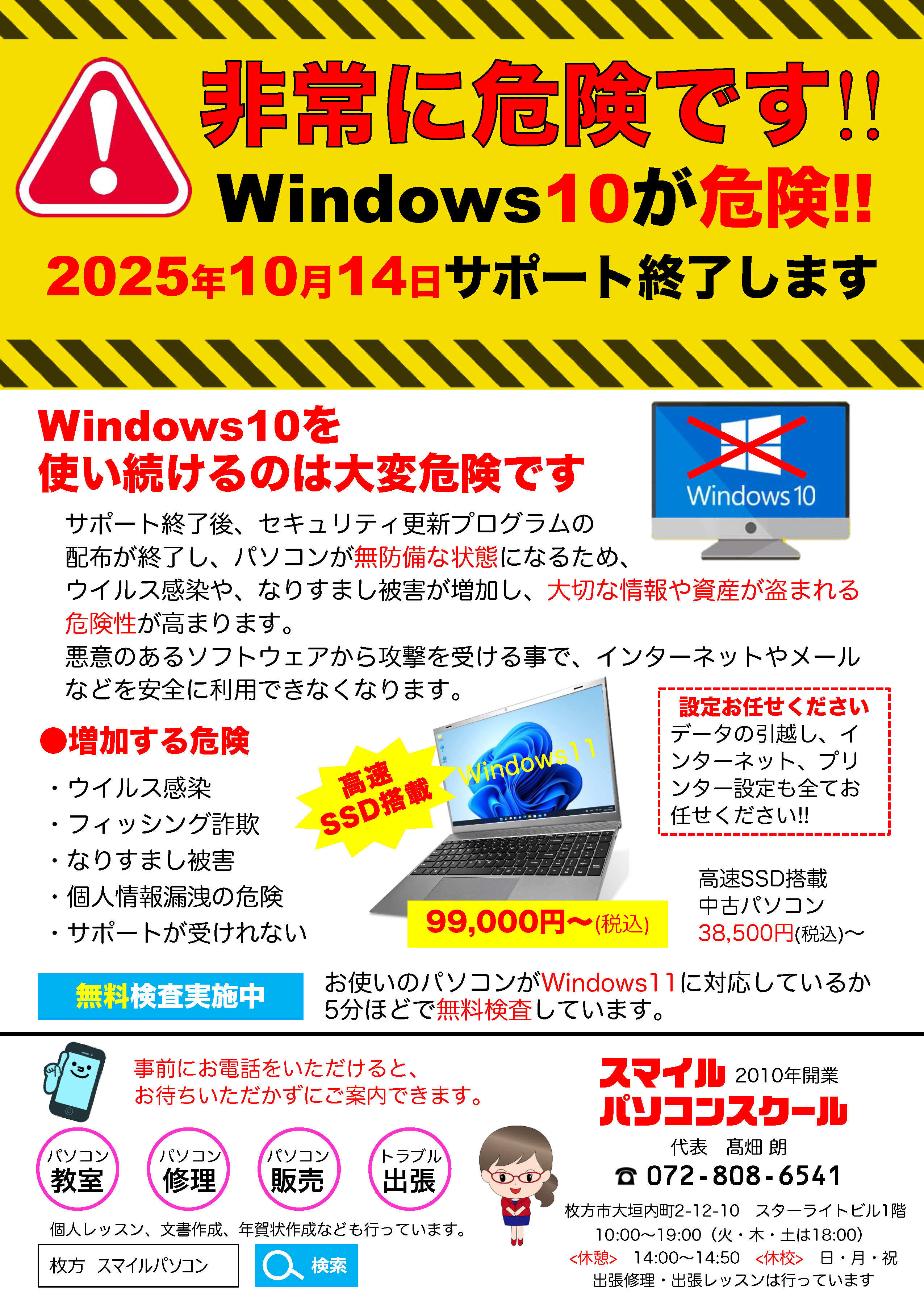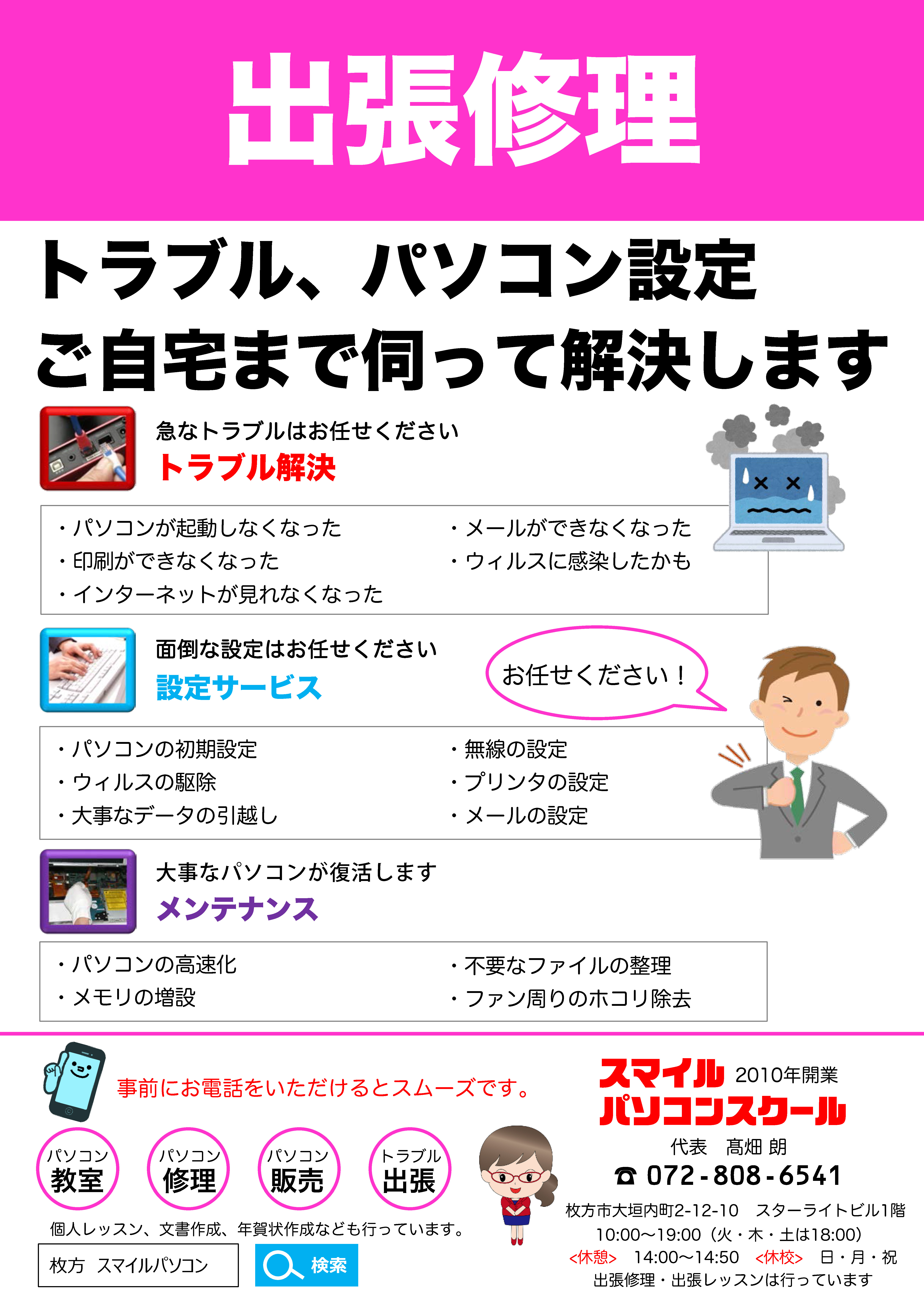 ※日・月・祝日は出張サポート、出張レッスンを行っています。 代表 高畑朗の携帯までご連絡ください。