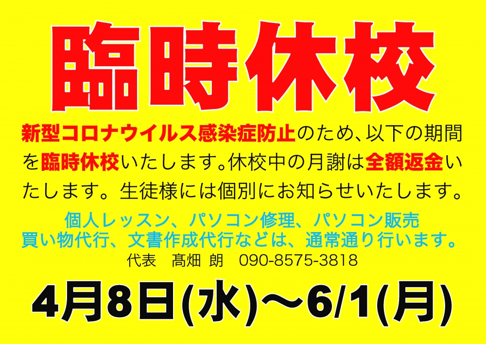 期間中、お困りの時は教室か、高畑の携帯へご連絡ください。