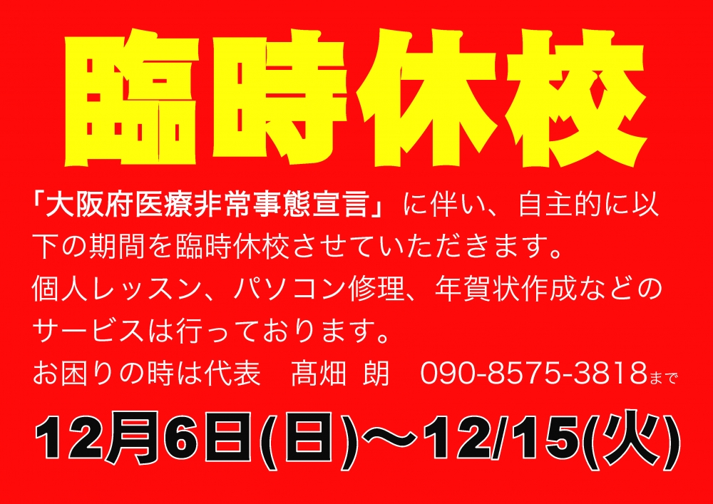 「大阪府医療非常事態宣言」に伴い、以下の期間を臨時休校いたします。